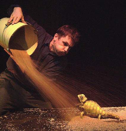 Da gibt es Steine, Eimer mit Sand, Wasser, einen Ventilator zur Winderzeugung. Naturgewalten wie Sandstürme oder Erdbeben werden gespielt wie emotionale Ausbrüche der Natur. Und schließlich wird Leben “erschaffen”. Es gibt Kisten mit Modellfiguren zur Bevölkerung der Landschaften. Schicksale werden inszeniert, Tiergattungen werden geschaffen und gehen wieder unter. Im Vordergrund steht dabei nicht eine bis ins Detail korrekte wissenschaftliche Darstellung der Evolution. Es soll vielmehr ein spielerischer und emotionaler Zugang zu dem Thema geschaffen werden.